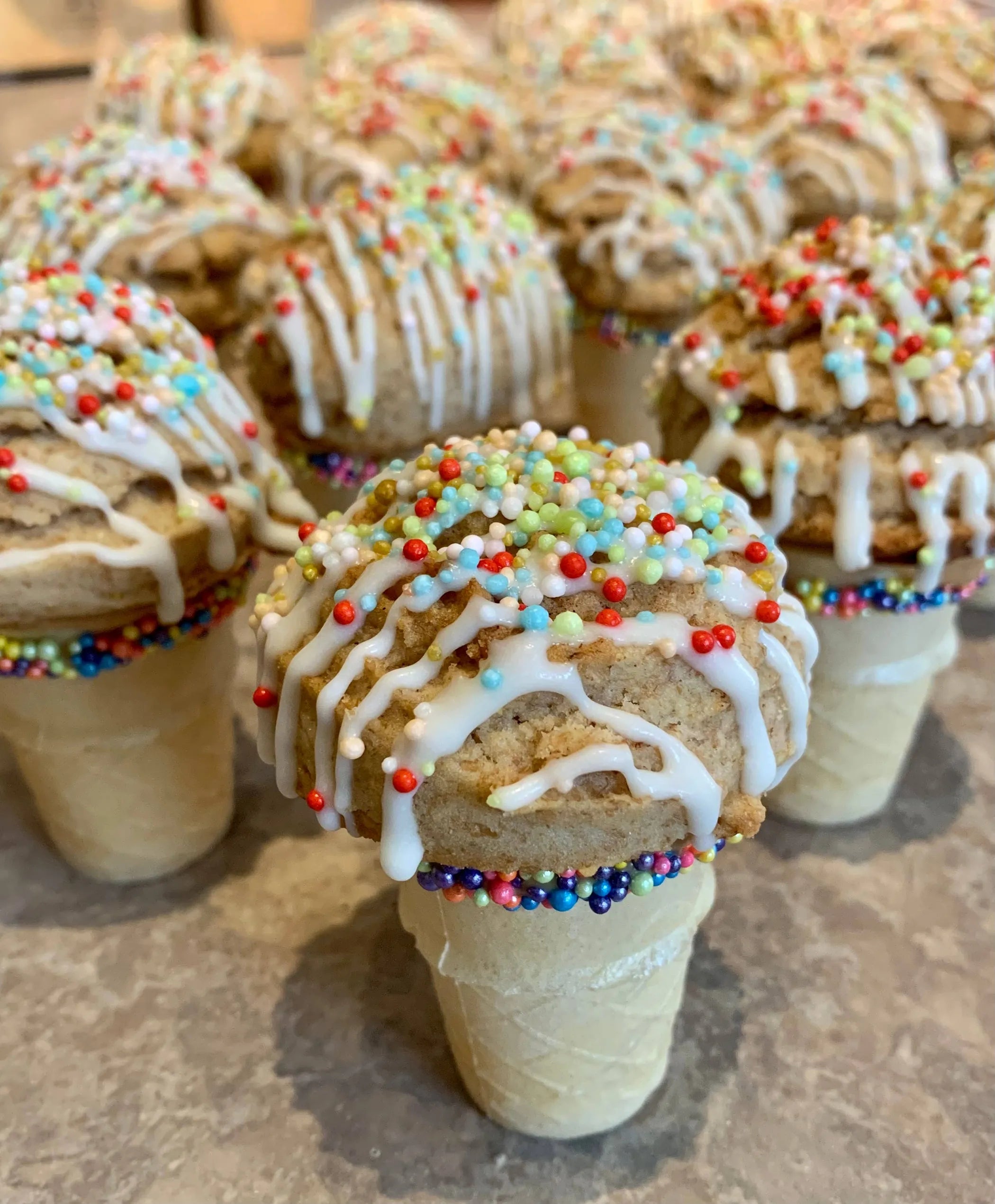 Cinnamon, honey cake ball placed on top of a miniature vanilla ice cream cone that has been dipped in peanut butter and rolled in sprinkles, then topped with vanilla icing and more sprinkles. Cookie size is large. Sprinkles color is subject to change with the season/holiday.
