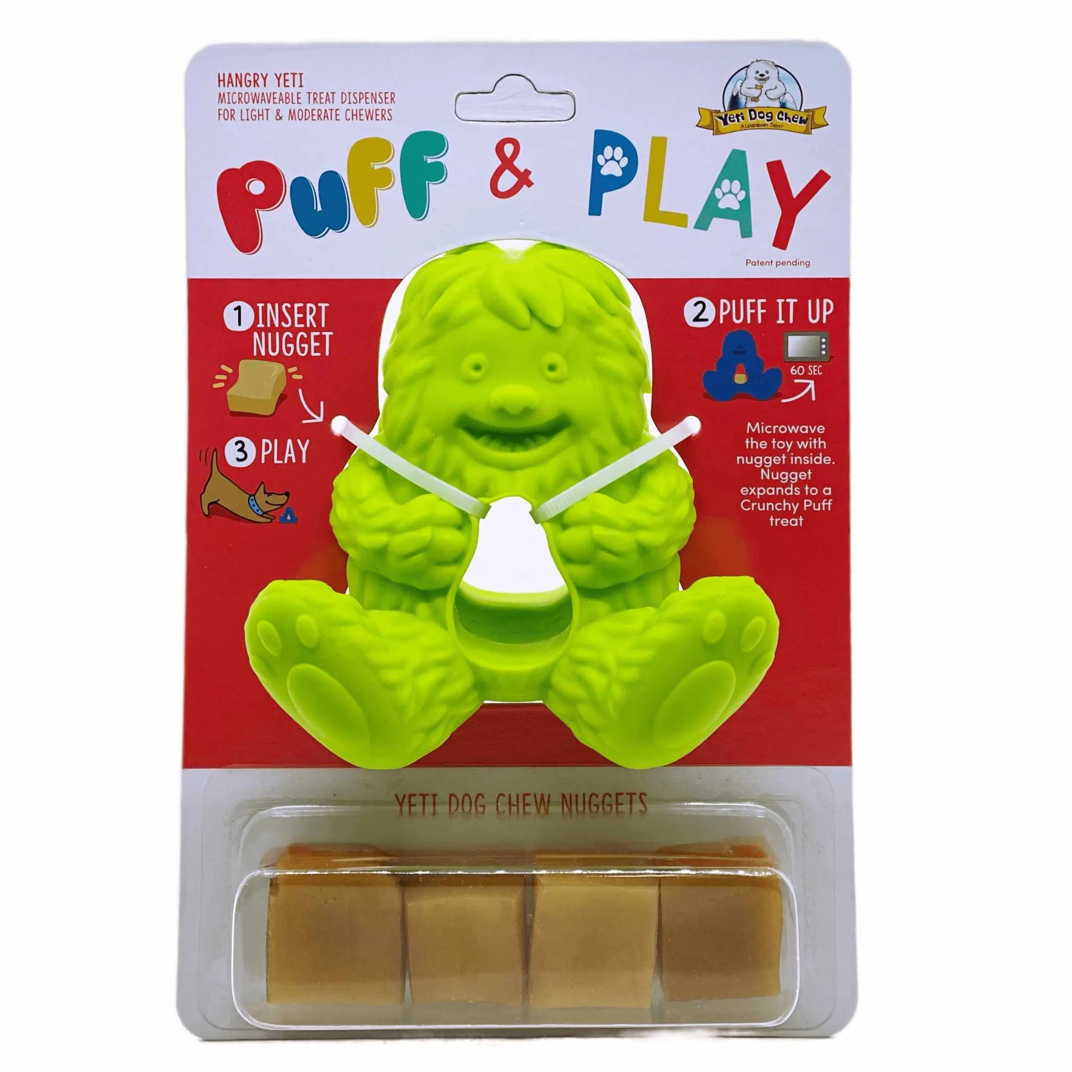 The Yeti Dog Chew Puff & Play Dog Chew Treat Dispenser combines treat time and playtime. This treat-dispensing toy is paw-fect for light and moderate chewers. Just insert a Yeti nugget (refills sold separately), place the toy and nugget in the microwave for one minute so the nugget puffs up, let it cool down and then let playtime commence. The nugget will puff up to twice its size and your furbaby can enjoy the crunchy treat. This long-lasting chew toy is even dishwasher safe for su-paw easy cleaning.