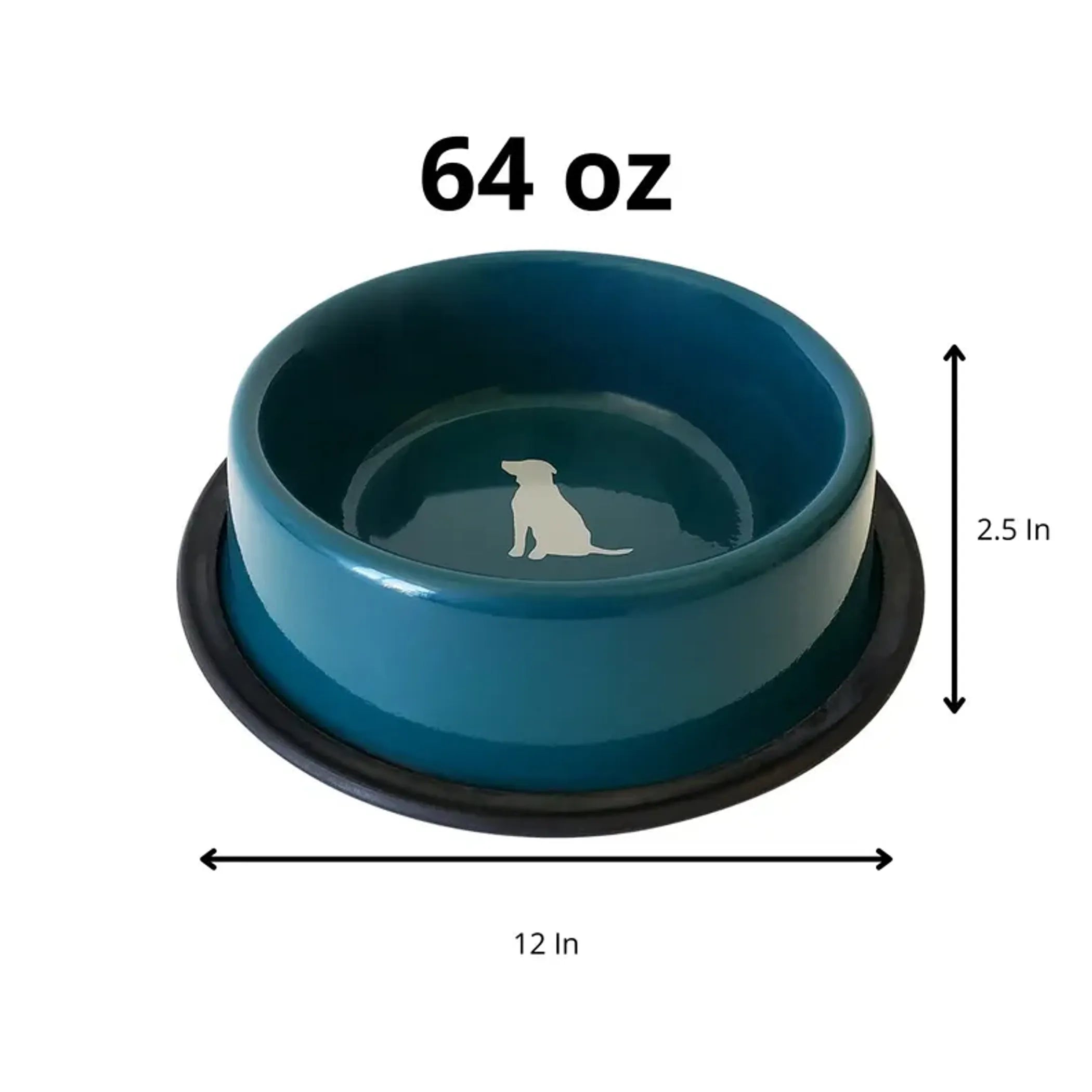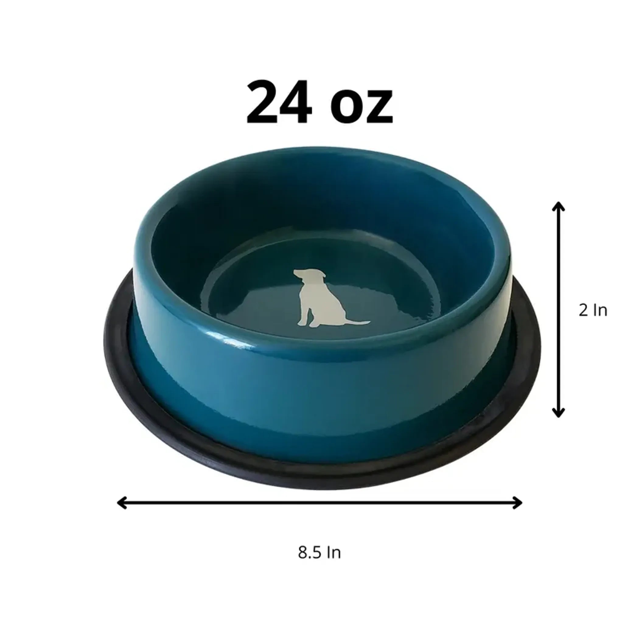 Appealing to those with understated style, these beautiful and practical matte stainless steel bowls are powder coated Teal with a Cool Gray Dog Silhouette printed inside. The removable black rubberized ring on the base ensures the bowl won?EURt tip, scratch or skid across floors. The low profile is ideal for small dogs and short snouts.