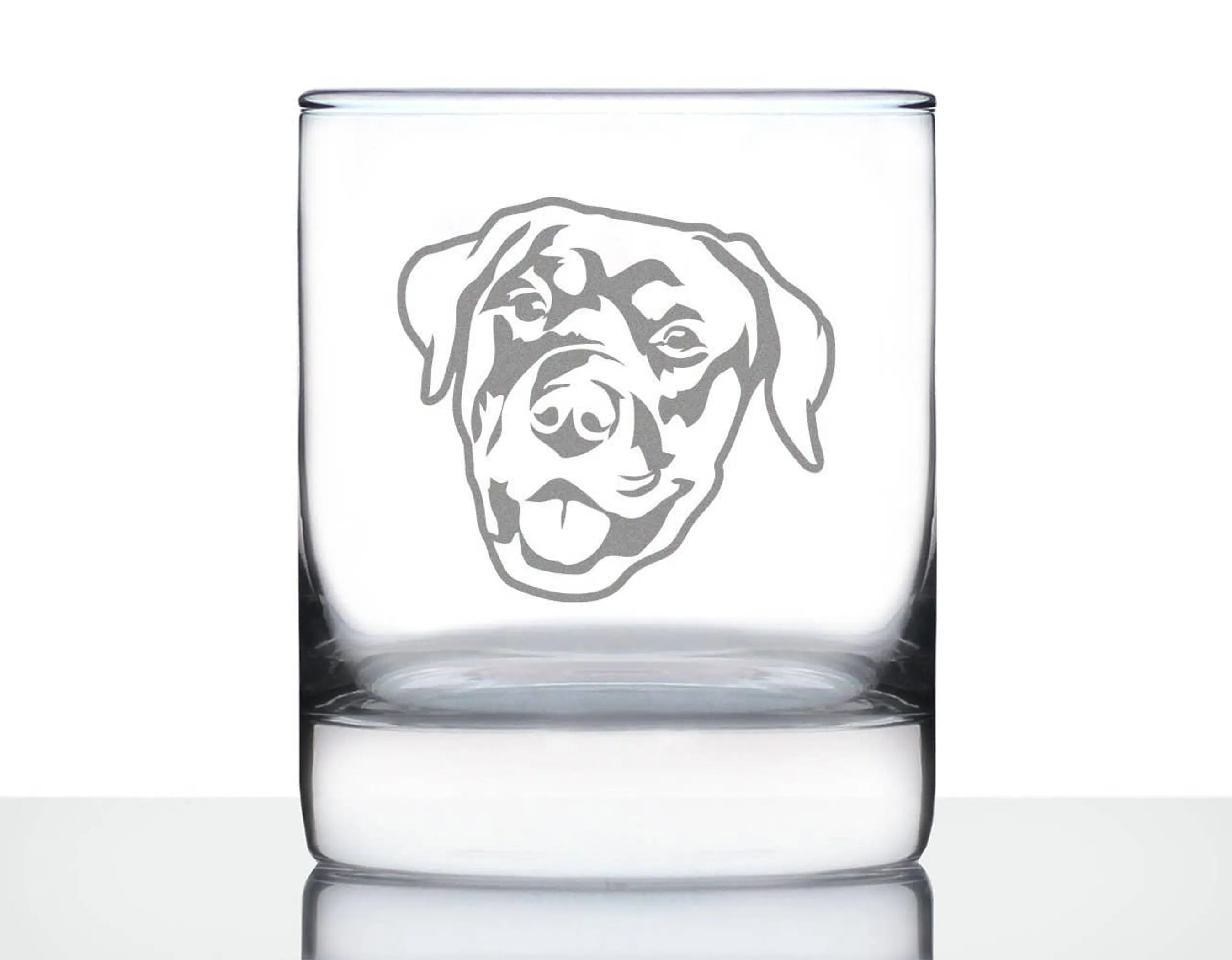 Happy Rottweiler Face - 10 oz Rocks Glass or Old Fashioned Glass, Etched Glassware, Cute Gifts for Dog Lovers with Rottweilers