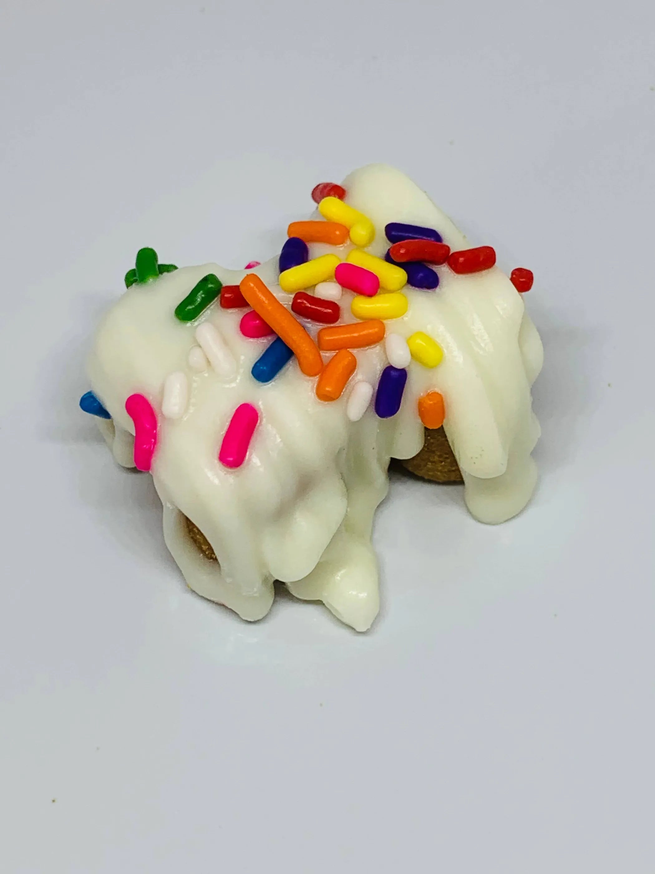 Peanut butter and banana dog cookie smothered with creamy vanilla icing and topped with fun sprinkles. Cookie size is small. Sprinkles color subject to change per season/holidays.